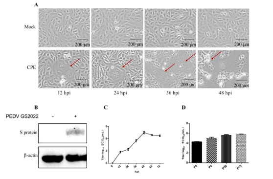 Hình 1. (A) Bệnh tích của virus PED trên tế bào Vero; (B) phát hiện protein S bằng Western Blot; (C) Đường cong sinh trưởng của PEDV GS2022; (D) Hiệu giá PEDV GS2022 sau 15 đời cấy truyền