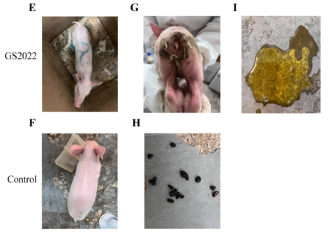 Thí nghiệm được thực hiện trên 2 nhóm heo 7 ngày tuổi, gồm nhóm heo được gây nhiễm virus PEDV GS2022 bằng đường miệng với liều 3x105.5TCID50/con. Thí nghiệm tương tự cũng được tiến hành trên heo con 3 ngày tuổi. Kết quả cho thấy virus gây bệnh rõ rệt nhưng không gây chết heo trong điều kiện thí nghiệm.