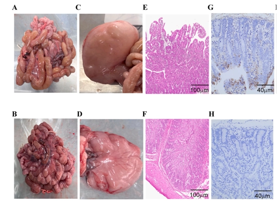 Hình 4. Bệnh tích đại thể và vi thể của nhóm heo thí nghiệm (A, C, E, G) và nhóm heo đối chứng (B, D, F, H)