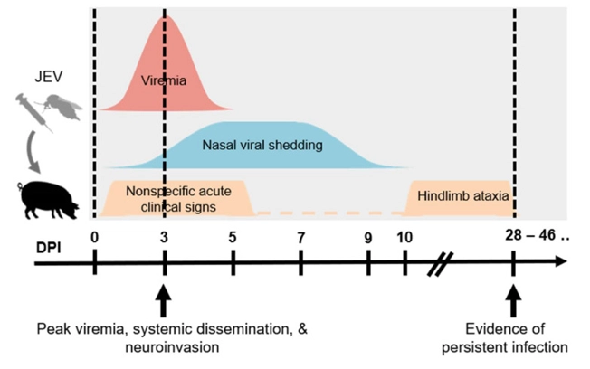 Sau khi Lợn bắt đầu bị nhiễm JEV (qua muỗi hoặc tiêm) đến ngày thứ 3 (3 DPI): lượng virus huyết đạt đỉnh, virus lan truyền trong cơ thể, xâm nhập hệ thần kinh; bắt đầu xuất hiện dấu hiệu lâm sàng cấp không đặc hiệu (sốt, mệt mỏi). Từ ngày thứ 2-9 DPI, virus bài thải qua dịch mũi, cho thấy nguy cơ lan truyền qua đường hô hấp. Sau 10 DPI, một số lợn xuất hiện mất điều hòa vận động chân sau là dấu hiệu tổn thương thần kinh. Từ 28–46 DPI, ghi nhận nhiễm dai dẳng, virus vẫn tồn tại trong cơ thể.