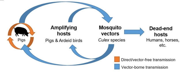 Các mắt xích quan trọng trong sự lan truyền và vai trò của các loài khác nhau: (1) Amplifying hosts (Vật chủ khuếch đại) bao gồm lợn và chim họ diệc (Ardeid birds); (2) Mosquito vectors (Muỗi truyền bệnh); (3) Dead-end hosts (Vật chủ ngõ cụt- vật chủ không truyền bệnh)